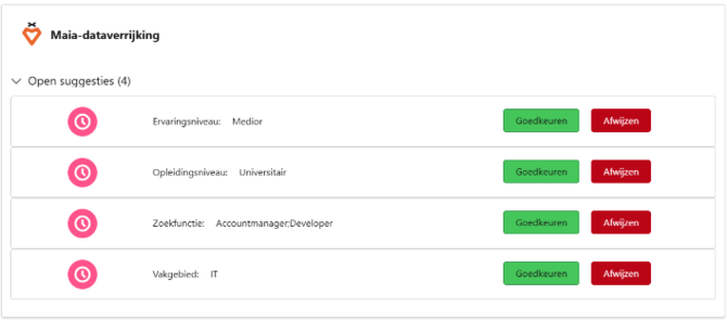 Met Maia dataverrijking heb je meerdere onderdelen die je kunt inzetten om op basis van het CV van de kandidaat (en/of de aangepaste velden in de algemene instellingen) gegevens van de kandidaat en vacature automatisch te verrijken.